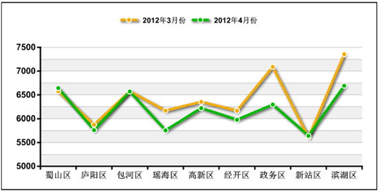 2012年3月份份合肥住宅區(qū)屬銷(xiāo)售均價(jià)及環(huán)比變化情況一覽圖