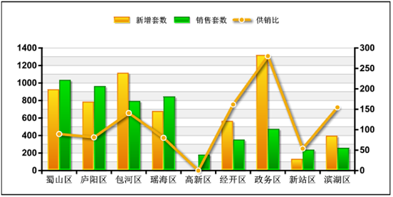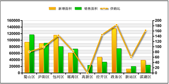 4月份期間高新區(qū)沒(méi)有新增住宅類(lèi)商品房,而其他各區(qū)的新增量均保持較高的狀況,其中有六區(qū)的新增量是超過(guò)了500套,而且包河區(qū)和政務(wù)區(qū)的新增量超過(guò)了1000套,蜀山區(qū)的新增量也接近于1000套。本月期間多區(qū)新增量出現(xiàn)上漲的主要原因是由于本月期間有大量新增項(xiàng)目的影響,而本月期間大部分區(qū)屬的供銷(xiāo)狀況呈現(xiàn)了供小于求的局面,只有包河區(qū)、經(jīng)開(kāi)區(qū)、政務(wù)區(qū)和濱湖區(qū)受到了大量新增項(xiàng)目的影響是呈現(xiàn)供大于求的局面。