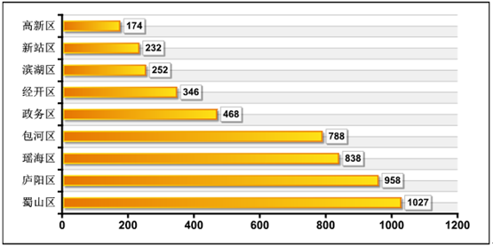 本月期間合肥住宅的區(qū)屬銷(xiāo)售中,包河區(qū)、瑤海區(qū)、政務(wù)區(qū)和濱湖區(qū)的銷(xiāo)售量是較之上月期間出現(xiàn)了上漲的現(xiàn)象,但是這四區(qū)中只有濱湖區(qū)的銷(xiāo)售量是呈現(xiàn)了較高的上漲幅度,濱湖區(qū)由于旭輝御府項(xiàng)目本月期間銷(xiāo)售量大幅度上漲使得濱湖區(qū)成為區(qū)屬銷(xiāo)售量上漲幅度最高的區(qū)域。在區(qū)屬銷(xiāo)售下跌的區(qū)域中,蜀山區(qū)和高新區(qū)是下跌幅度最高的區(qū)域,其中蜀山區(qū)是銷(xiāo)售套數(shù)和變化幅度最大的區(qū)域,而且蜀山區(qū)也是本月期間唯一一個(gè)銷(xiāo)售量超過(guò)1000套的區(qū)域。