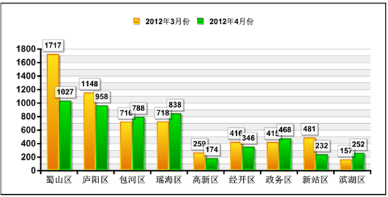 區(qū)屬2012年3月份2012年4月份環(huán)比蜀山區(qū)17171027-40.19%廬陽(yáng)區(qū)1148958-16.55%包河區(qū)71678810.06%瑤海區(qū)71883816.71%高新區(qū)259174-32.82%經(jīng)開(kāi)區(qū)416346-16.83%政務(wù)區(qū)41546812.77%新站區(qū)481232-51.77%濱湖區(qū)15725260.51% 2012年4月份區(qū)屬住宅銷(xiāo)售量及環(huán)比變化表