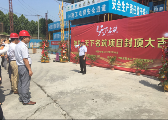 2017年7月18日上午,合肥天下名筑項(xiàng)目一期建設(shè)工地橫幅高掛,彩旗飄飄。伴隨著最后一方混凝土的澆筑,項(xiàng)目一期主體結(jié)構(gòu)全部封頂。