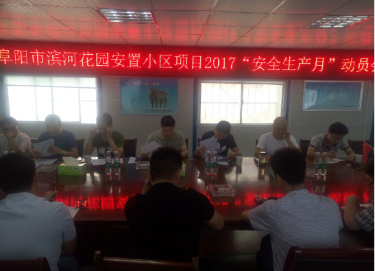 2017年6月13日,阜陽(yáng)城市公司組織濱河花園項(xiàng)目總包、監(jiān)理單位相關(guān)負(fù)責(zé)人召開(kāi)2017年“安全生產(chǎn)月”和“安全生產(chǎn)江淮行”動(dòng)員會(huì)。阜陽(yáng)城市公司全體成員參加了動(dòng)員會(huì)。