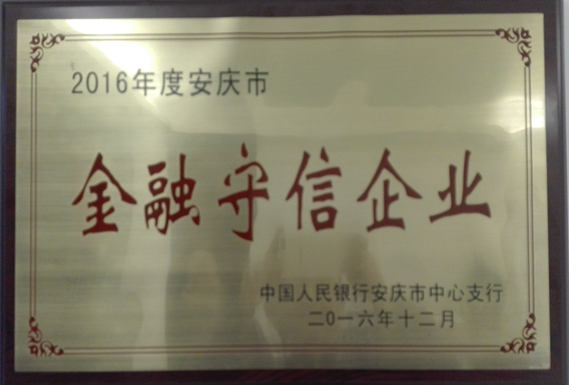 根據(jù)《安慶市金融守信企業(yè)評(píng)定實(shí)施辦法》,經(jīng)安慶市中級(jí)人民法院、市住建委、地稅局、國稅局、工商局等有關(guān)部門的嚴(yán)格評(píng)議,并由安慶市銀行行長聯(lián)席會(huì)議評(píng)定,皖投同安公司榮獲2016年度安慶市“金融守信企業(yè)”稱號(hào)。