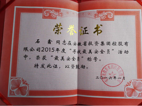近日,皖投同安公司副總經(jīng)理石鑫榮獲集團(tuán)公司2015年度“最美安全員”稱(chēng)號(hào)。
