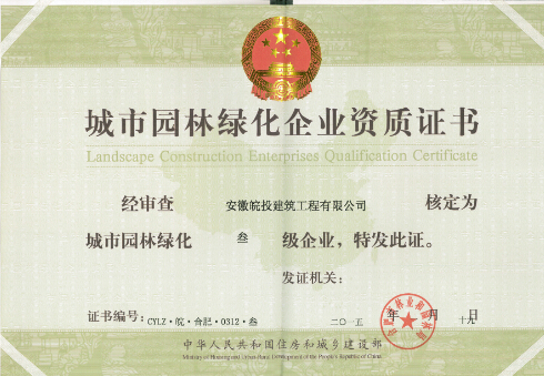 2015年1月27日,安徽皖投建筑工程有限公司正式取得園林三級資質(zhì)。自2014年7月以來,建筑公司根據(jù)制訂的資質(zhì)申報計(jì)劃,有條不紊的進(jìn)行資質(zhì)相關(guān)軟件、硬件及人員資料的準(zhǔn)備,于2014年底上報審批部門,并于2015年元月順利取得資質(zhì)。