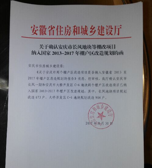 2015年8月31日,皖投同安公司兩個(gè)在建棚改項(xiàng)目安慶市長風(fēng)地塊和大橋開發(fā)區(qū)C-6地塊獲安徽省住房和城鄉(xiāng)建設(shè)廳正式確認(rèn),納入國家2013-2017年棚戶區(qū)改造規(guī)劃。
