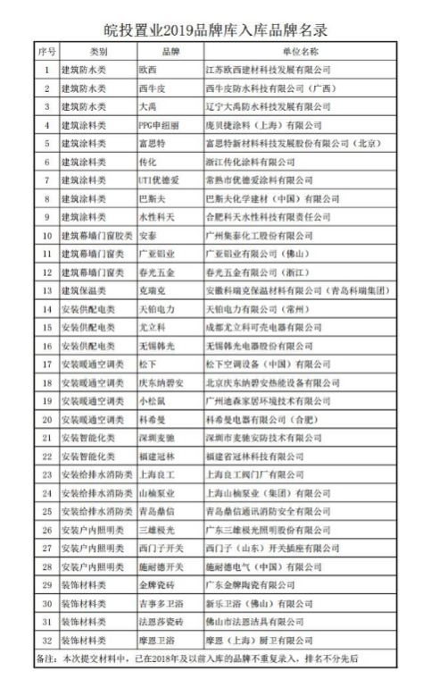 附件:皖投置業(yè)2019品牌庫入庫品牌名錄