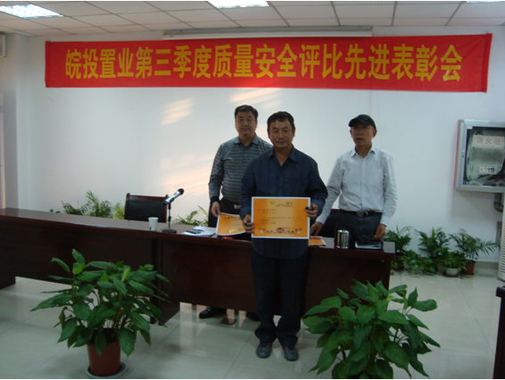 2012年10月15日下午,項目管理總監(jiān)丁昌華在公司會議一室主持召開了2012年三季度質(zhì)量安全評比表彰會,工程管理部,皖投置業(yè)各項目部、施工單位、監(jiān)理單位的項目負(fù)責(zé)人及相關(guān)人員參加。