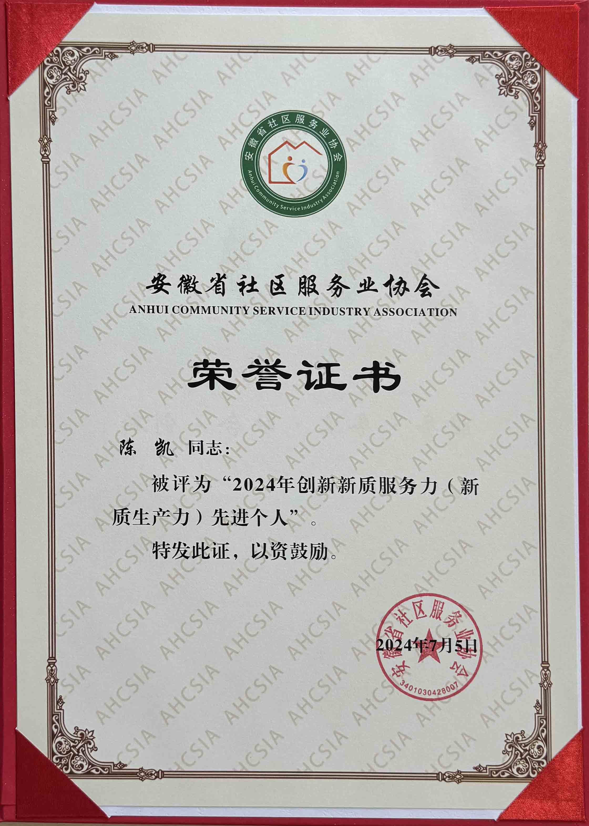 皖投服務(wù)公司榮獲“2023年度安徽省社區(qū)服務(wù)業(yè)協(xié)會突出貢獻(xiàn)單位”,陳凱同志被評為“2024年創(chuàng)新新質(zhì)服務(wù)力(新質(zhì)生產(chǎn)力)先進(jìn)個人”。